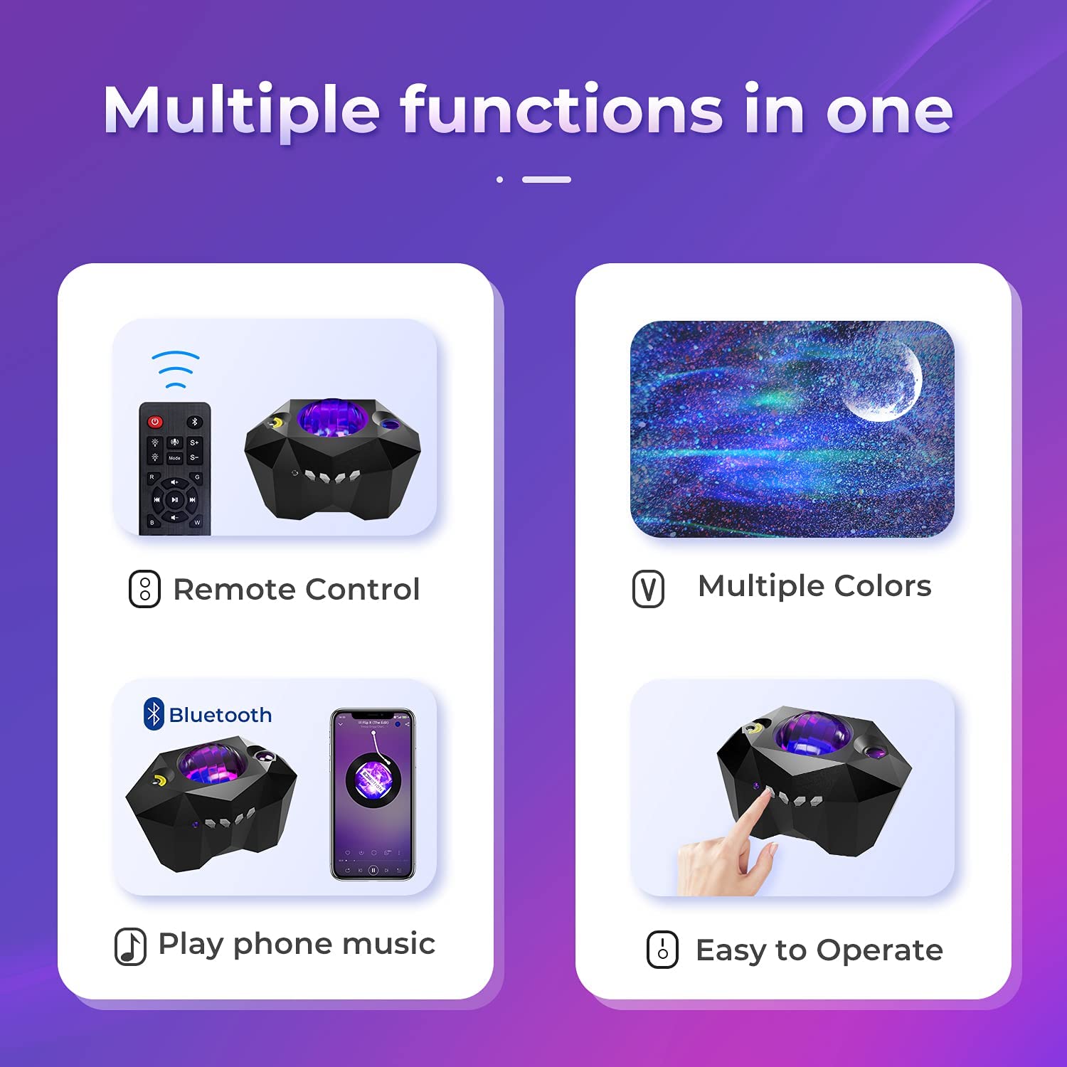 Works with smartphones via Bluetooth,play local music through mobile phone, then youâll see the light will change color with themusic beats.resulting in a starry sky projection.Voice Control(Only control the lights speed). |